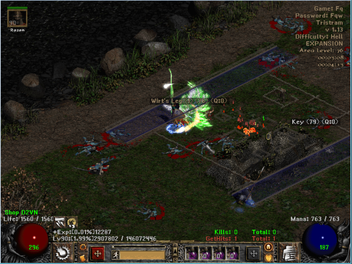 - Tiếp theo bạn sẽ chạy tới vị trí góc cuối bên trái Mini map sẽ có 1 xác chết phân hủy đã lâu có tên là Wirt, khi bạn click vào xác chết thì sẽ rớt 1 vật phẩm là Wirt’s Leg (ngẫu nhiên từ 1 – 3 lỗ muốn khảm gì cũng được). Đương nhiên đây là nguyên liệu quan trọng bạn cần mang theo