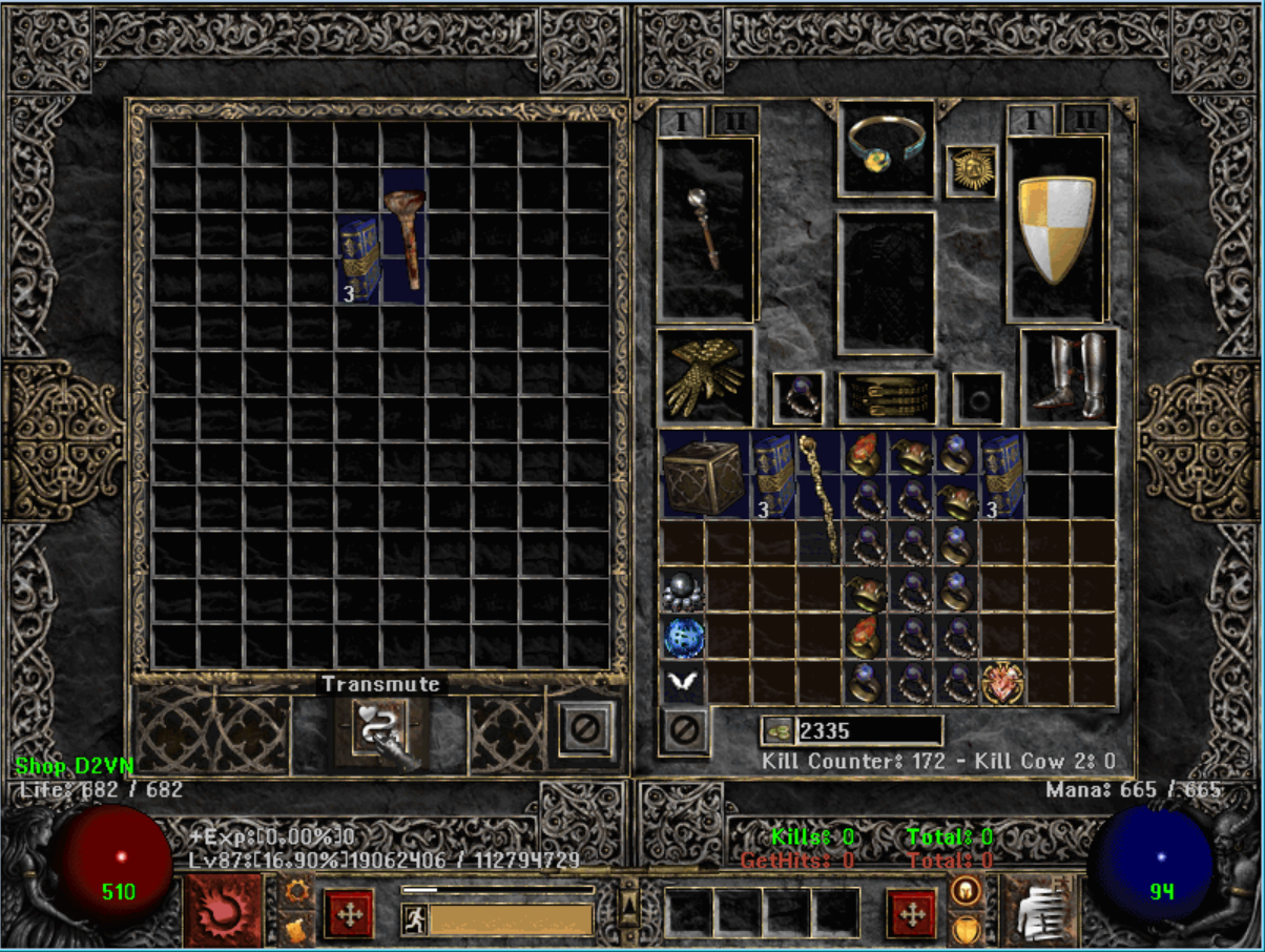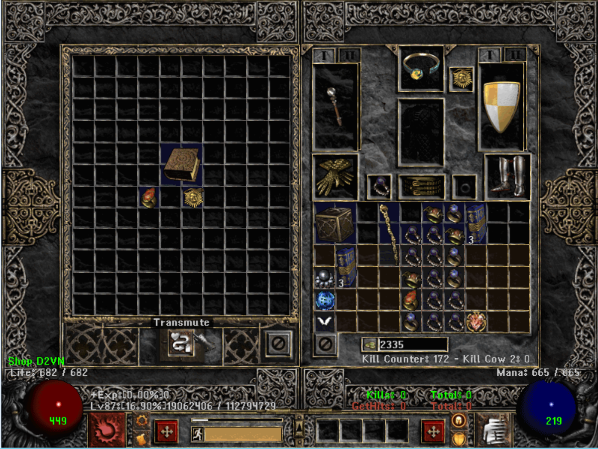 - Bỏ nguyên liệu Wirt’s Leg và Tome of Town Portal vào Cube. Sau đó click nút Transmute và đáp ứng 2 điều kiện đầu, bạn sẽ mở được cổng dẫn tới Map Secret Cow Lvl 1 – Thế giới Bò biết đi trong truyền thuyết. Đây là Map dễ Farm dành cho Newbie trong giai đoạn đầu nếu chơi Necromancer Summonner.